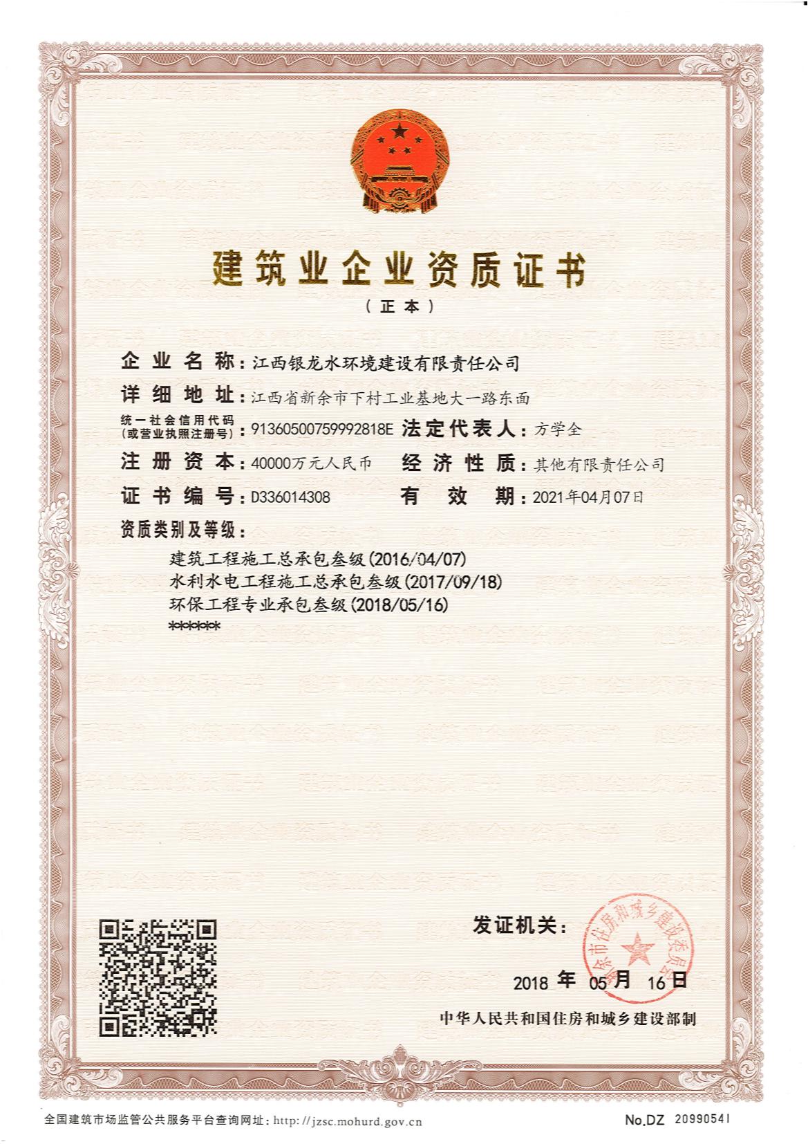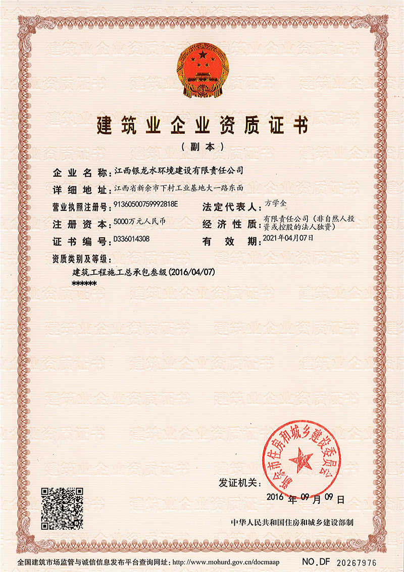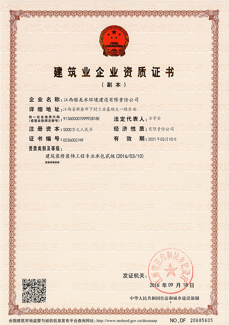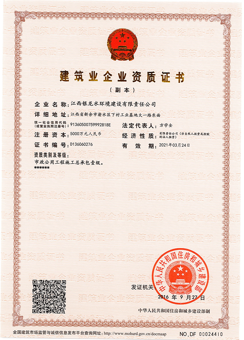 江西銀龍水環(huán)境建設(shè)有限責(zé)任公司是一家具備市政公用工程施工總承包壹級(jí)、裝飾工程專業(yè)承包貳級(jí)、屋房建筑工程施工總承包叁級(jí)資質(zhì)的大型企業(yè)集團(tuán)。公司成立于2004年,注冊(cè)資金為10億元人民幣,主要從事市政工程建設(shè),市政工程設(shè)計(jì)、咨詢,水利水電工程建設(shè),土木工程建設(shè),建筑裝飾工程,綠化工程,工程設(shè)備及材料銷售和水污染治理等業(yè)務(wù)。公司于2017年通過(guò)了ISO國(guó)際質(zhì)量、環(huán)境、職業(yè)健康與安全三個(gè)體系認(rèn)證。