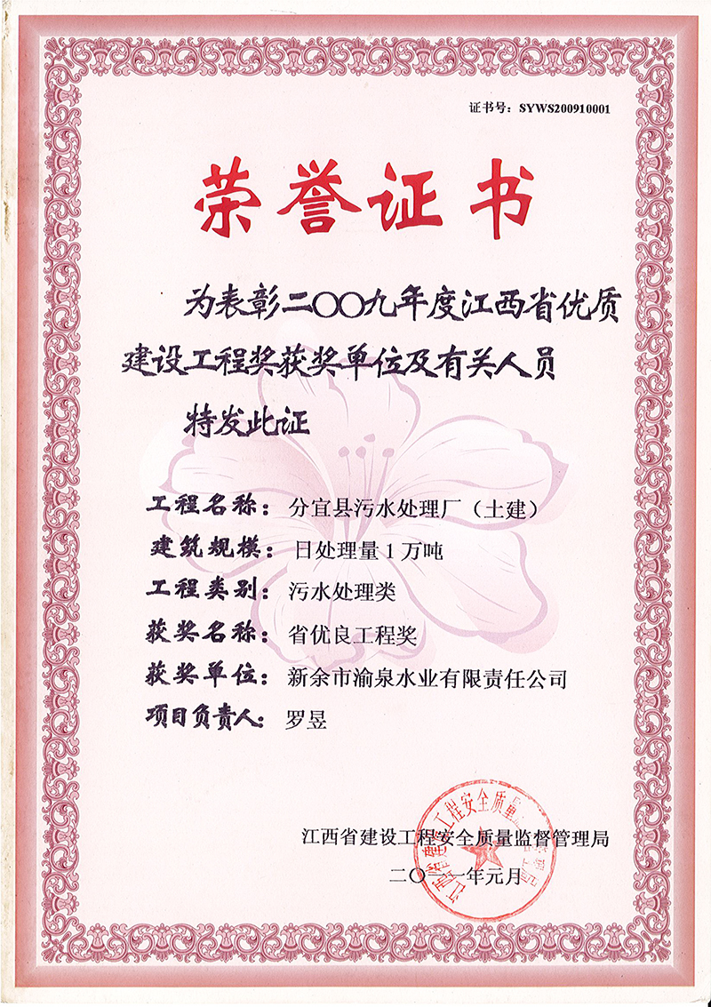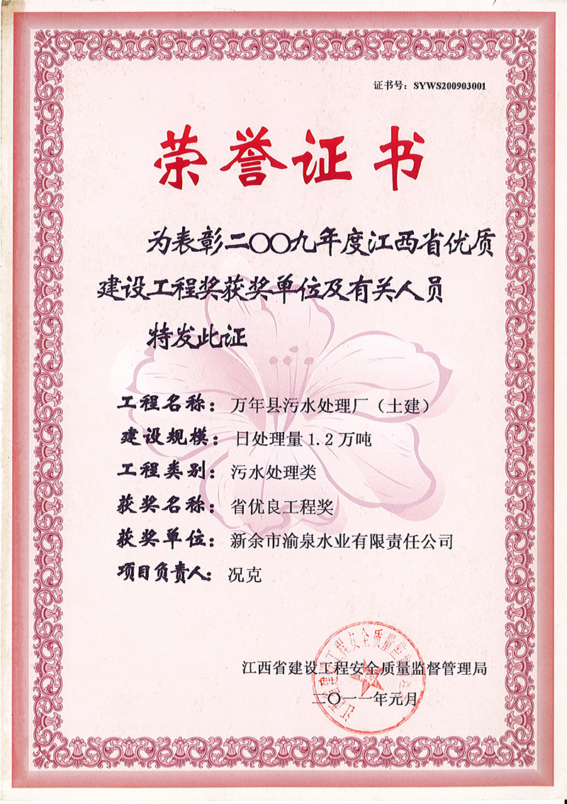 分宜縣污水處理廠獲2009年度江西省優(yōu)秀工程建設(shè)獎(jiǎng)、萬(wàn)年縣污水處理廠獲2009年度江西省優(yōu)秀工程建設(shè)獎(jiǎng)