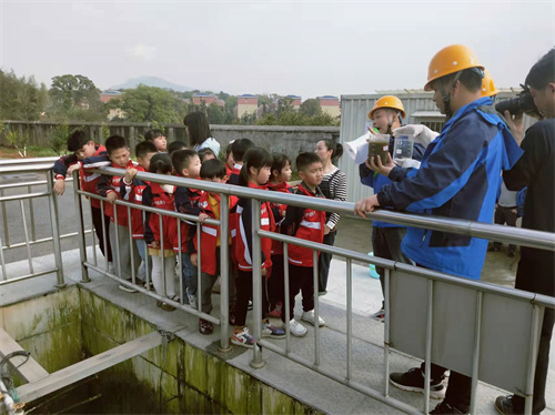 在參觀生物處理池(氧化溝)時,講解員從池中提取污水給小朋友參觀,不少小朋友好奇問到“水為什么這么臟?” 講解員解答到:“生活用水、工業(yè)用水會使清水受到污染,而污水排放又會使江河湖泊里的水受污染變臟,人們接觸或者喝臟水,就很可能生病甚至中毒、死亡”。走到進(jìn)出水口時,講解員又現(xiàn)場提取進(jìn)廠水、出廠水向小朋友們進(jìn)行對比展示,小朋友們直觀看到了污水處理的效果,連說“太神奇”。