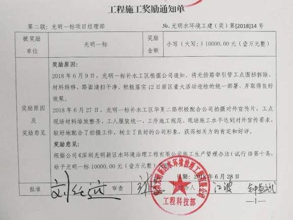中電建水環(huán)境公司在《工程施工獎勵通知單》中指出,光明一標補水工區(qū)能夠積極落實12日光明新區(qū)重大活動迎檢的統(tǒng)一部署和配合宣傳工作,做好現(xiàn)場材料堆放整齊,工人服裝統(tǒng)一,工序施工規(guī)范,樹立了良好的公司形象,獲得了好評。